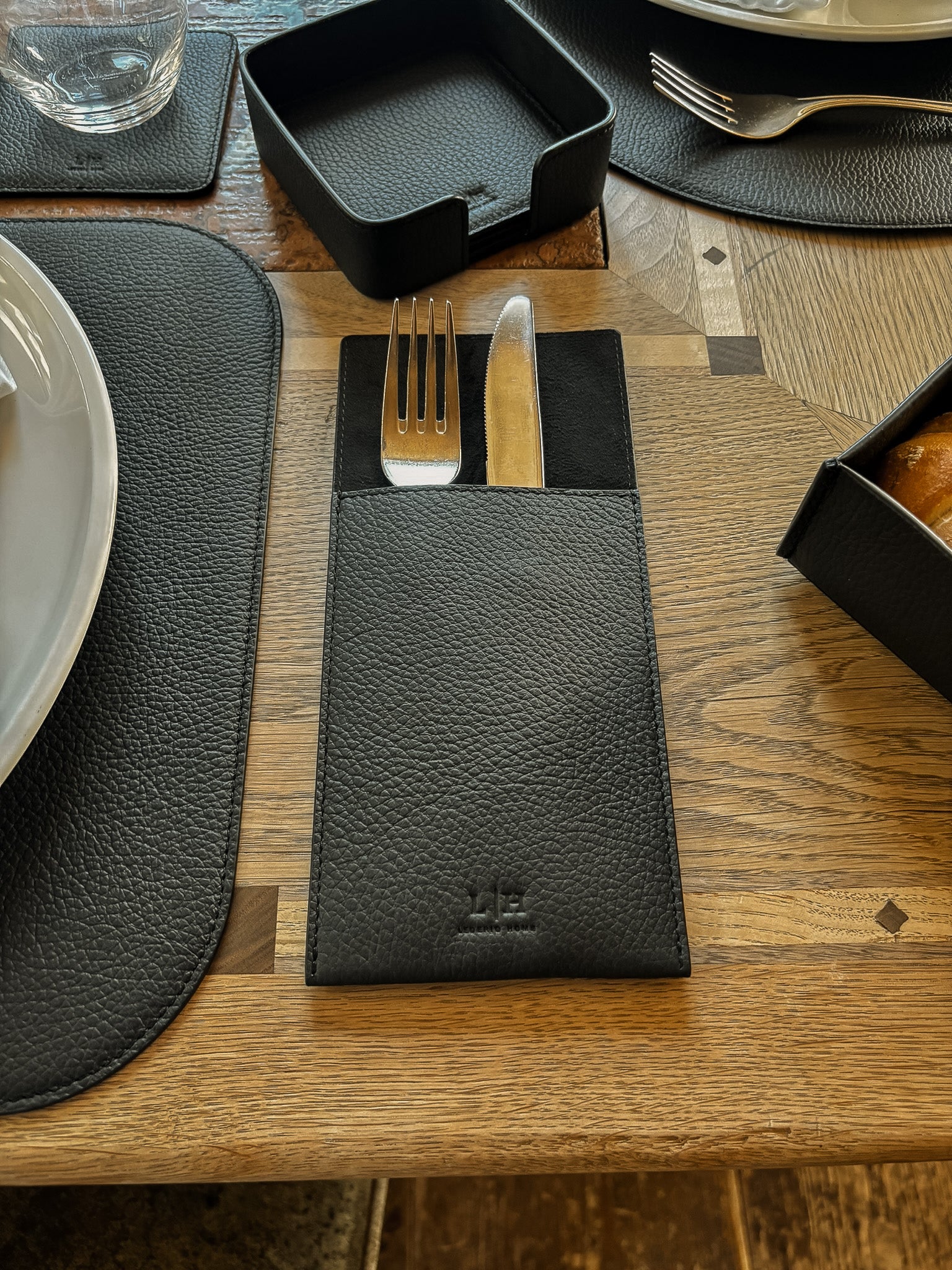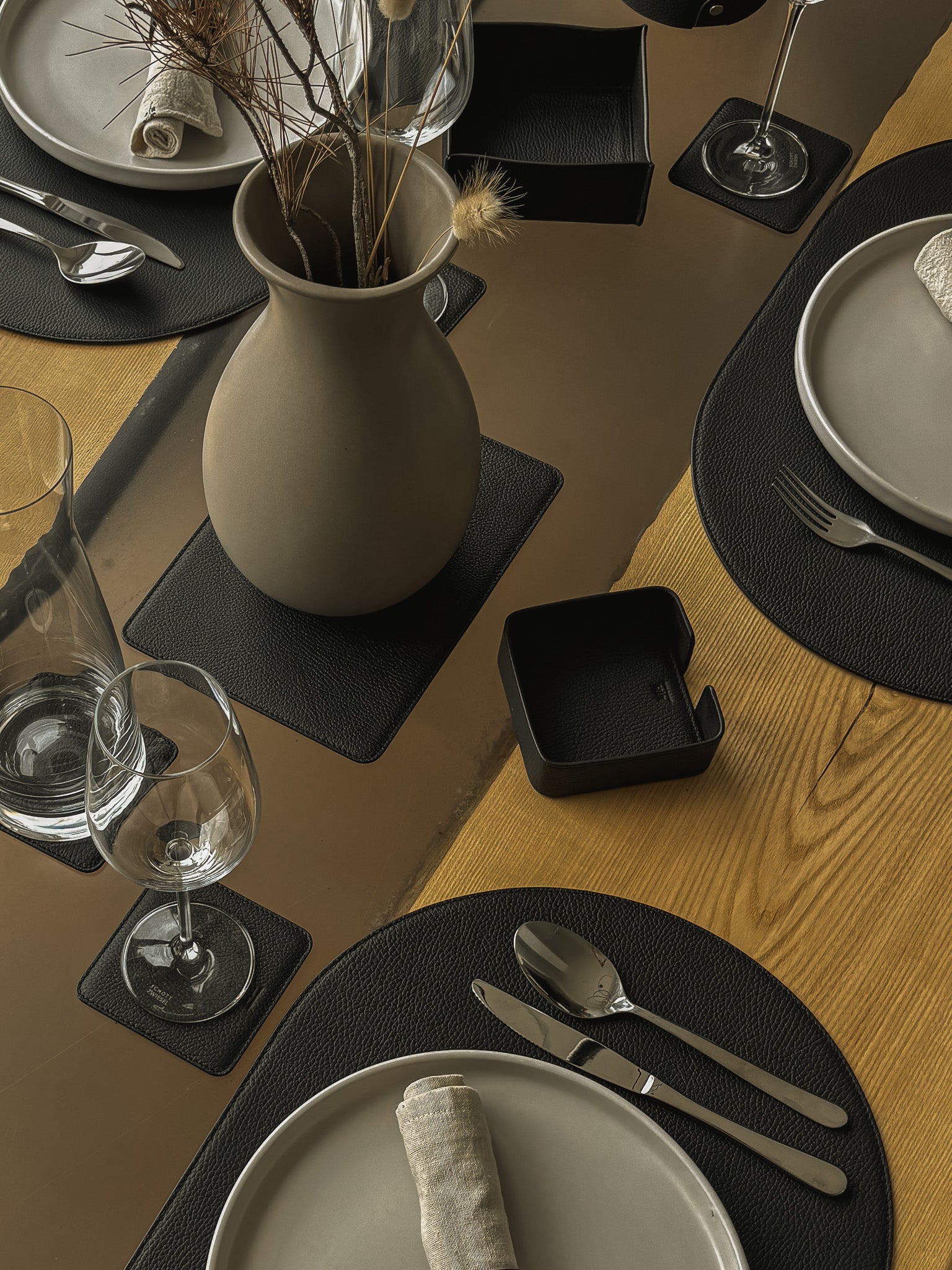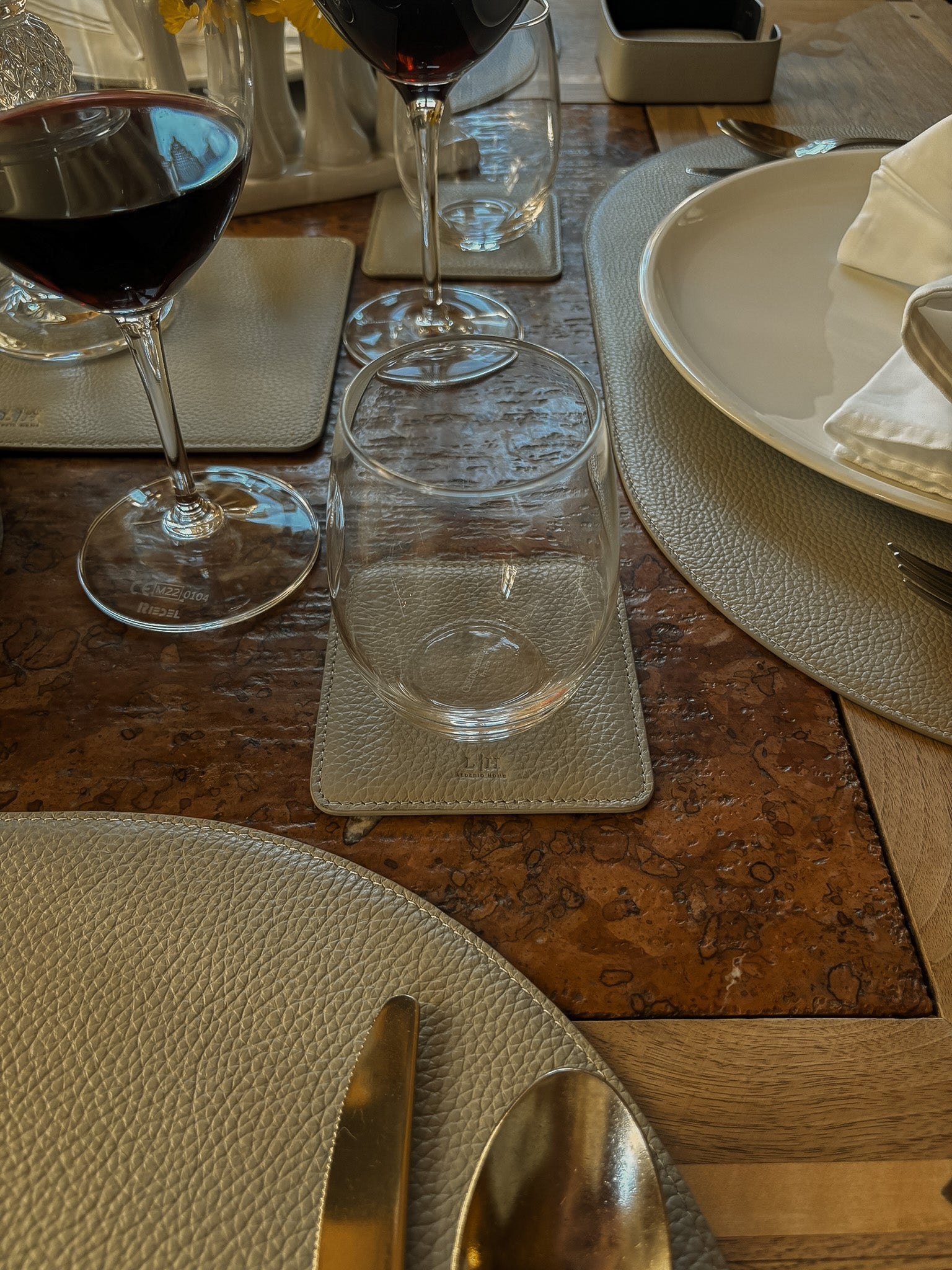 6 quadratische Leder-Glasuntersetzer im Set – inkl. Halter