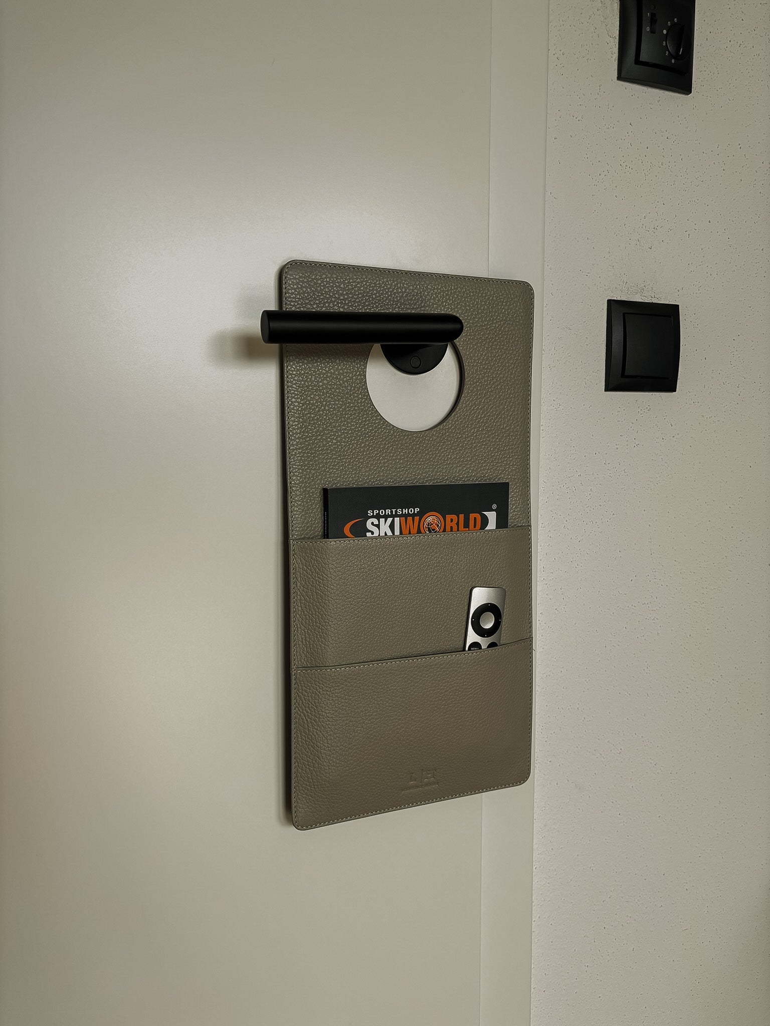 Dieser Hängeorganizer aus echtem Leder (40 × 20 cm) vereint Funktionalität mit edlem Design. Ob im Flur, Schlafzimmer, Büro oder Badezimmer – er bietet Platz für Schlüssel, Brillen, Notizen oder Kosmetik und sorgt für stilvolle Ordnung an der Wand. Durch die strukturierte Aufteilung sind wichtige Kleinigkeiten immer griffbereit. Die hochwertige Lederoberfläche wirkt elegant, während die Rückseite mit Mikrofaser versehen ist, um Wände zu schützen. Mit stabiler Schlaufe zum Aufhängen. In den Farben Stone, Shadow und Noir erhältlich.