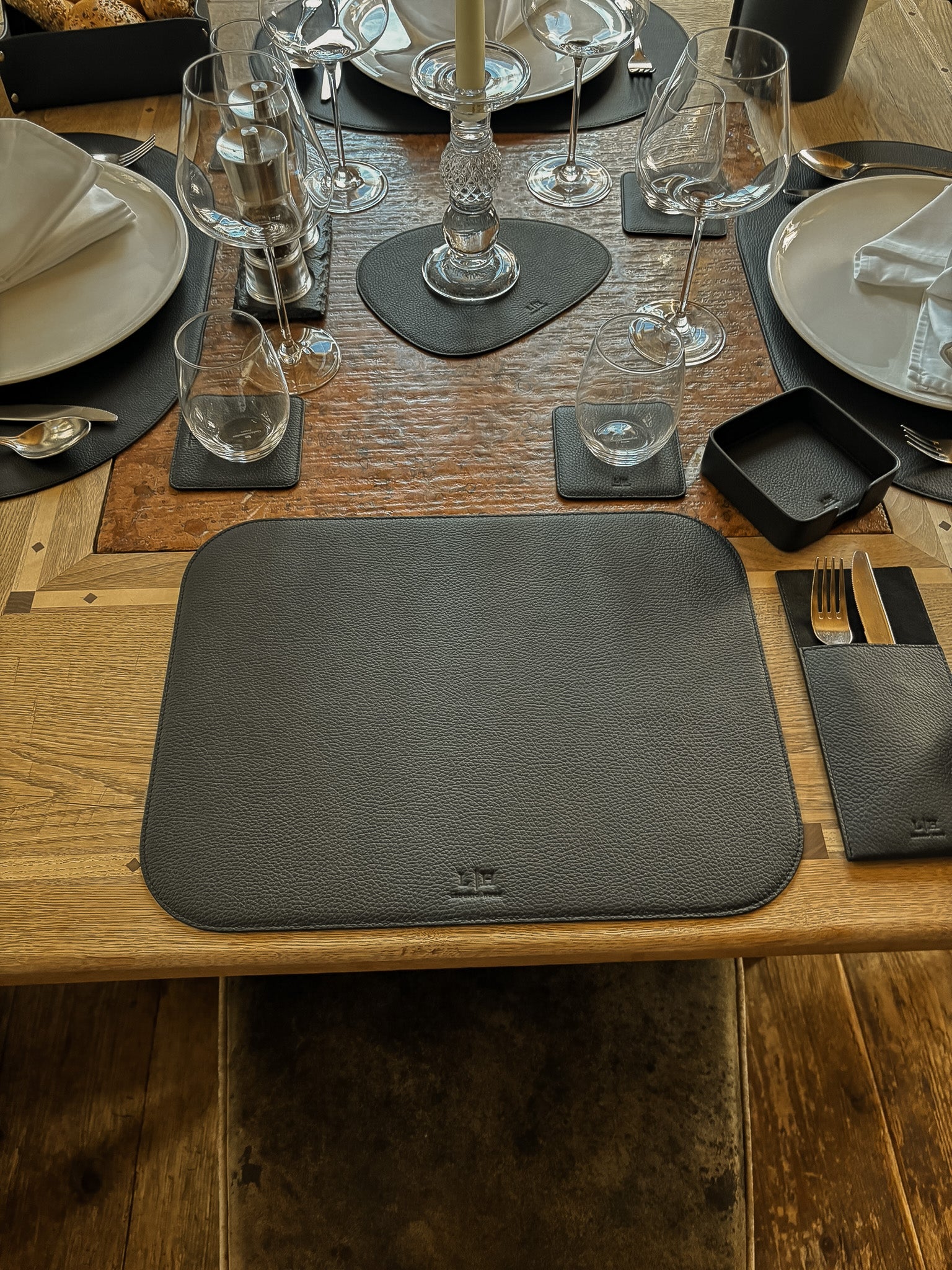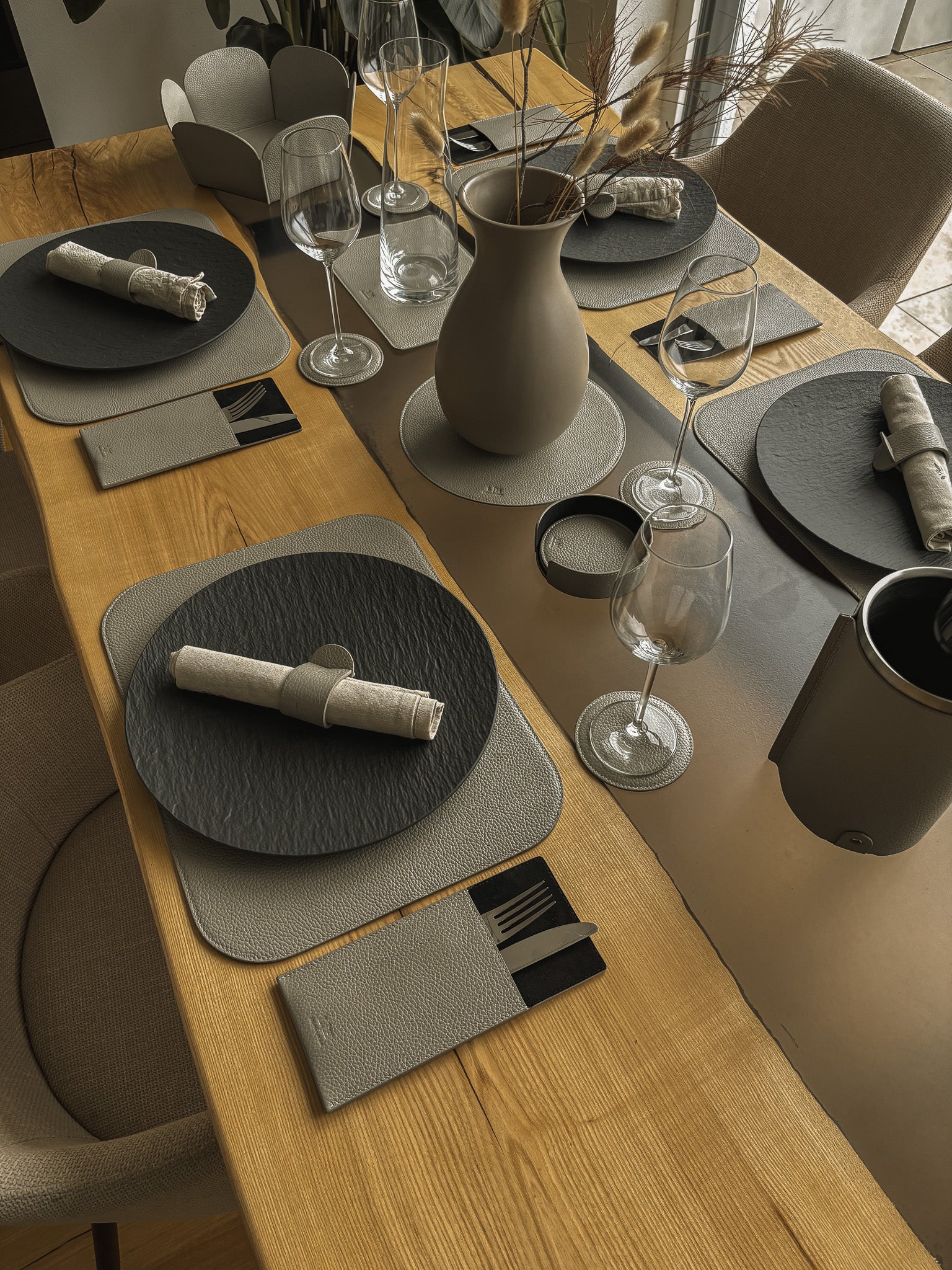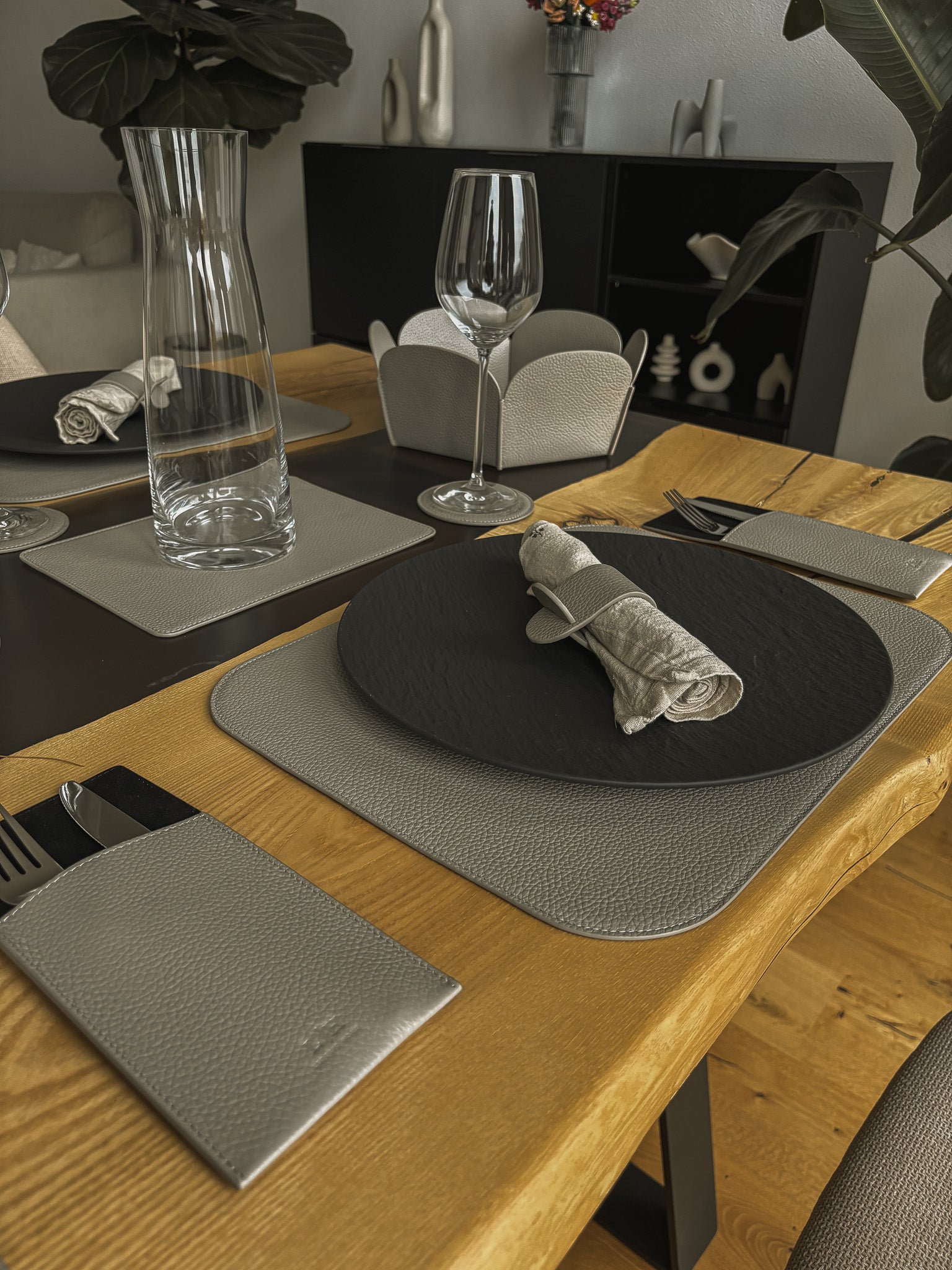Setzen Sie mit unseren eleganten Platzsets aus echtem Leder stilvolle Akzente auf Ihrem Esstisch. Ob für den täglichen Gebrauch oder für festliche Anlässe – dieser rechteckige Telleruntersetzer vereint zeitloses Design mit hochwertiger Verarbeitung. Gefertigt aus echtem, strapazierfähigem Leder überzeugt das Platzset nicht nur durch seine edle Optik, sondern auch durch eine angenehm griffige Haptik. Es ist pflegeleicht, abwischbar und besticht durch seine natürliche Struktur – jedes Stück ein Unikat. Das rechteckige Format (ca. 41×31 cm) bietet ausreichend Platz für Teller, Besteck und Gläser und schützt zugleich empfindliche Tischoberflächen vor Flecken, Hitze und Kratzern. In Kombination mit weiteren Leder-Accessoires aus unserer Kollektion entsteht ein harmonisches Tischbild. Egal ob im Esszimmer, auf dem Küchentisch, in stilvollen Restaurants oder in der gehobenen Hotellerie – das Lederio-Platzset ist die ideale Wahl für alle, die Wert auf Ästhetik, Qualität und Nachhaltigkeit legen. Erhältlich in drei edlen Farben (Stone, Shadow, Noir) fügt es sich mühelos in verschiedene Einrichtungsstile ein. Auch als stilvolles Geschenk eignet sich das Platzset hervorragend – auf Wunsch in einer eleganten Geschenkbox verpackt.