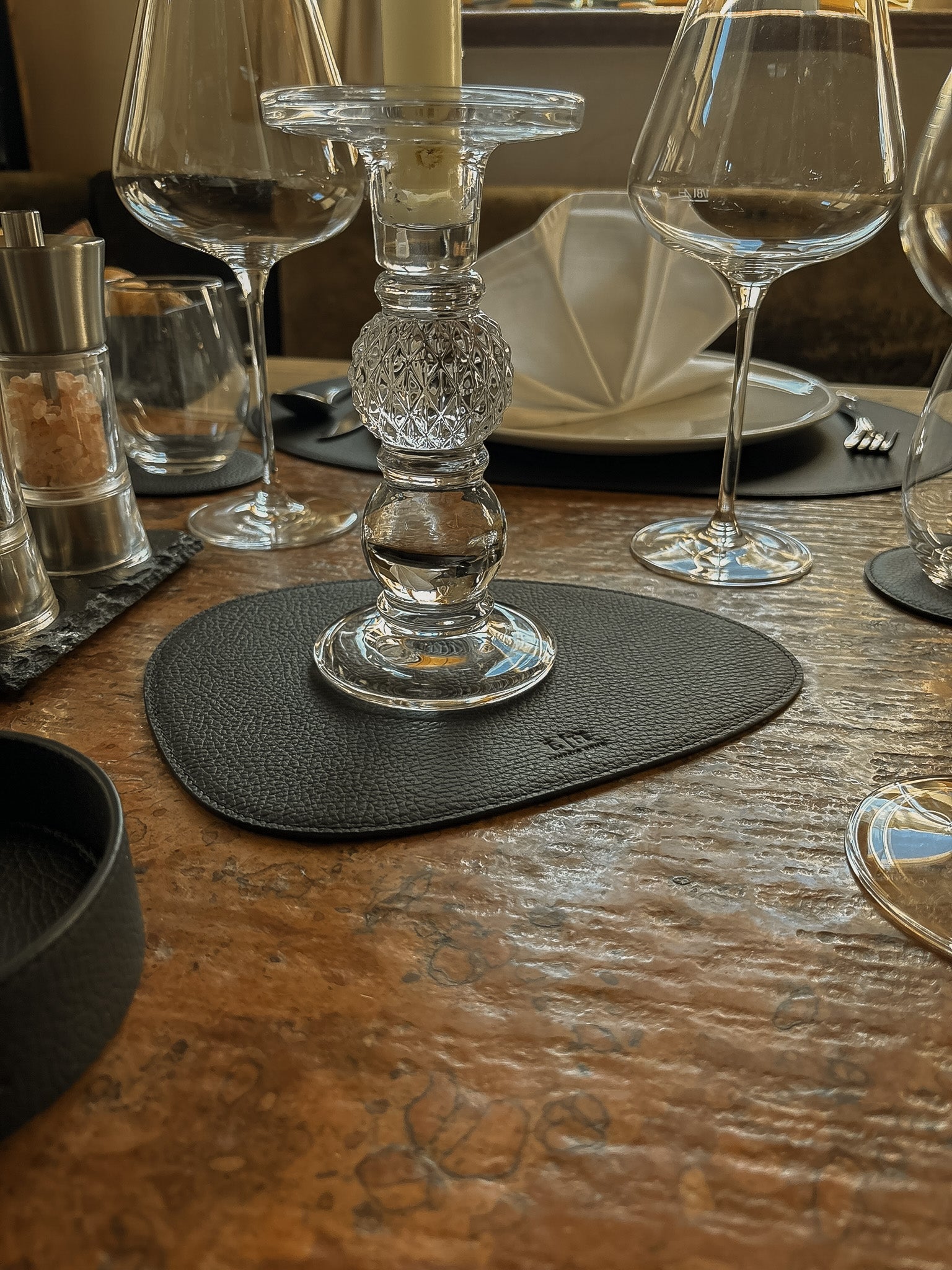 Diese asymmetrisch geschnittene Unterlage (24 × 18 cm) aus echtem Leder bringt Abwechslung und moderne Eleganz auf Tisch, Sideboard oder Kommode. Ideal als dekorative Basis für kleine Teller, Schalen, Kerzen oder Vasen. Die formschöne Silhouette setzt stilvolle Akzente, während die Rückseite aus schwarzer Mikrofaser für Rutschfestigkeit sorgt und Oberflächen schützt. Ein hochwertiges Accessoire für individuelles Interior-Styling – erhältlich in Stone, Shadow und Noir.